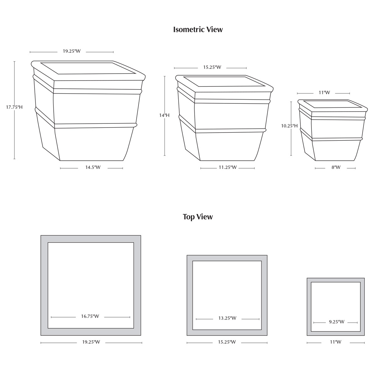 | Size | Set of 3 19.25"W x 19.25"L x 17.75"H | 69 lbs 15.25"W x 15.25"L x 14"H | 45 lbs 11"W x 11"L x 10.25"H | 20 lbs |