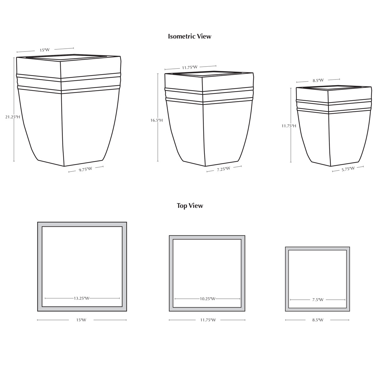 | Size | Set of 3 15"W x 15"L x 21.25"H | 53 lbs 11.75"W x 11.75"L x 16.5"H | 28 lbs 8.5"W x 8.5"L x 11.75"H | 13 lbs |