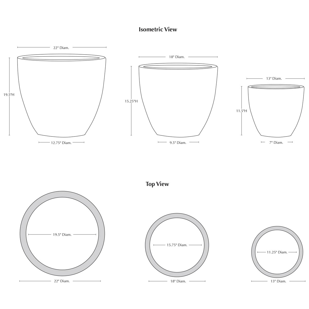 | Size | Set of 3 22″DIA x 19.5″H | 70 lbs 18″DIA x 15.25″H | 39 lbs 13″DIA x 11.5″H | 22 lbs |