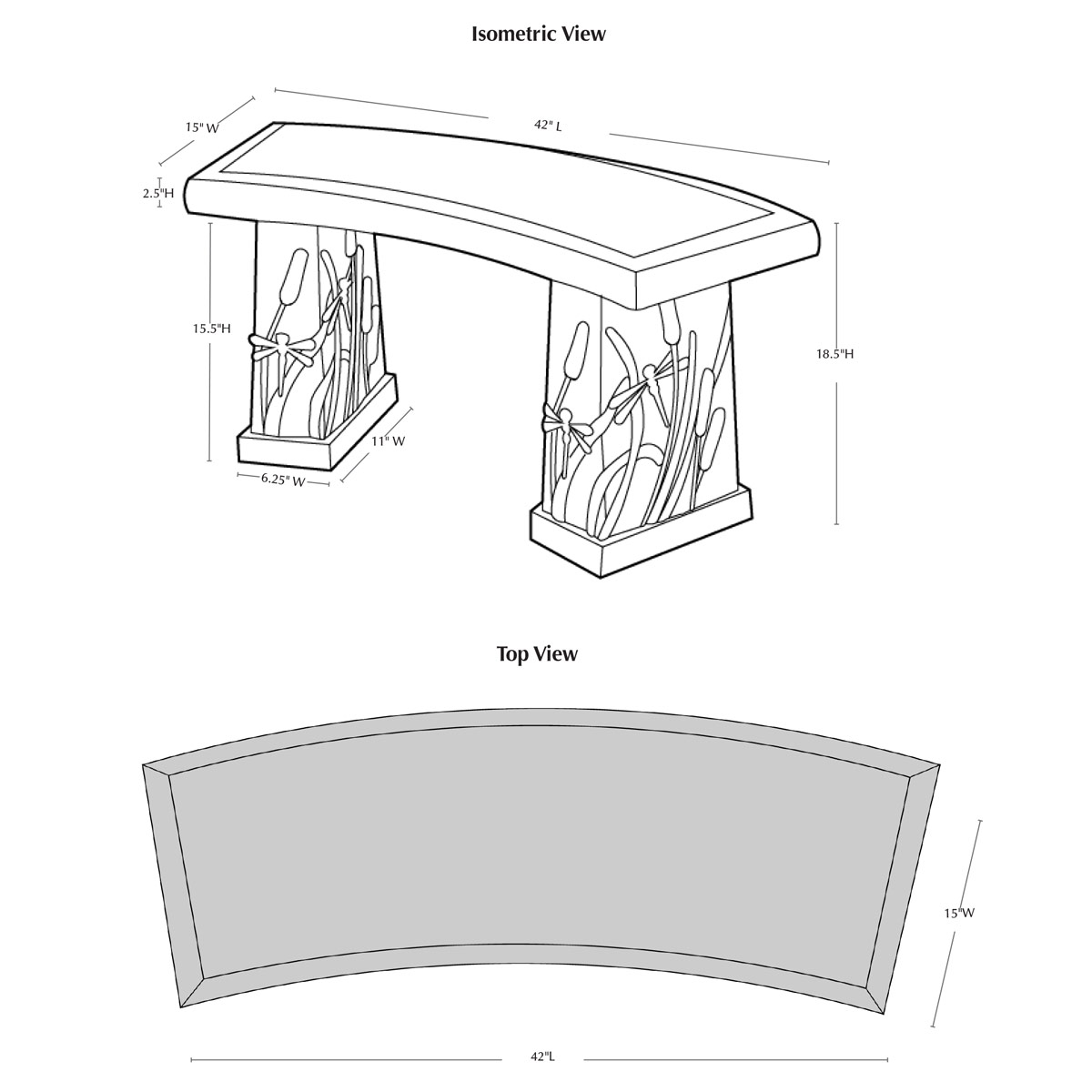 Add a touch of nature to your garden with the Dragonfly Curved Bench, an ideal spot for relaxing or enjoying the view. Crafted from durable cast stone and featuring decorative dragonfly and cattail motifs, this bench adds a whimsical element to any outdoor space. See a similar design garden fountain. *As shown patina: Alpine Stone