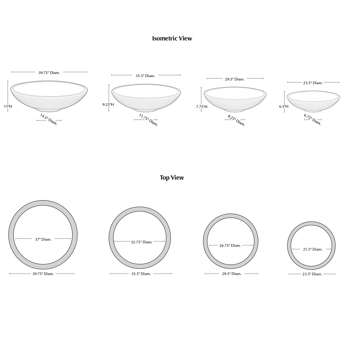 | Size | 23.5″DIA x 6.5″H | 45 lbs 29.5″DIA x 7.75″H | 83 lbs 35.5″DIA x 9.25″H | 136 lbs 39.75″DIA x 11″H | 186 lbs |