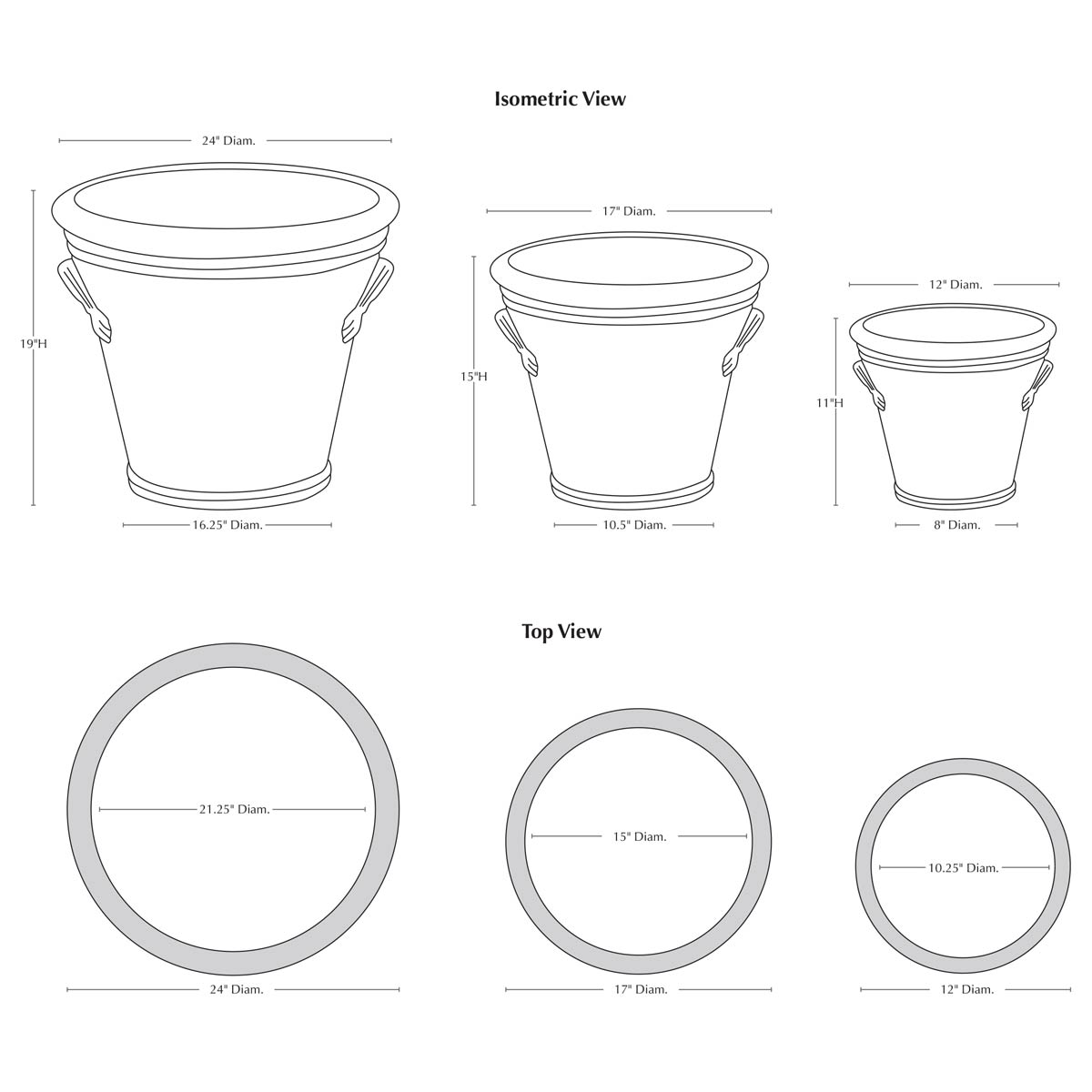 | Size | Set of 3 24.5″DIA x 20″H | 71 lbs 17″DIA x 15″H | 36 lbs 12"DIA x 11"H | 15 lbs |