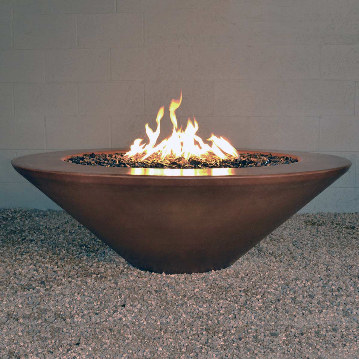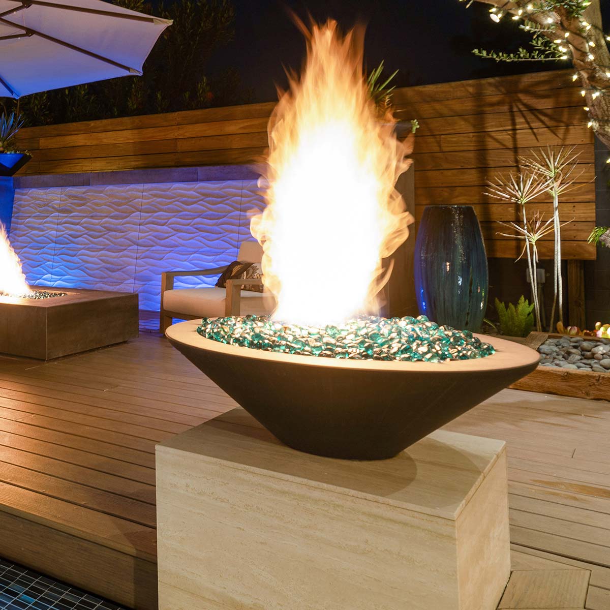 The Geo Round “Essex” Fire Table and Fire Bowl each provide a nice round tapered look. The two larger sizes have a table top ledge capable of holding a drink. 4 different sizes to accommodate any need for a fire pit in an outdoor space.
