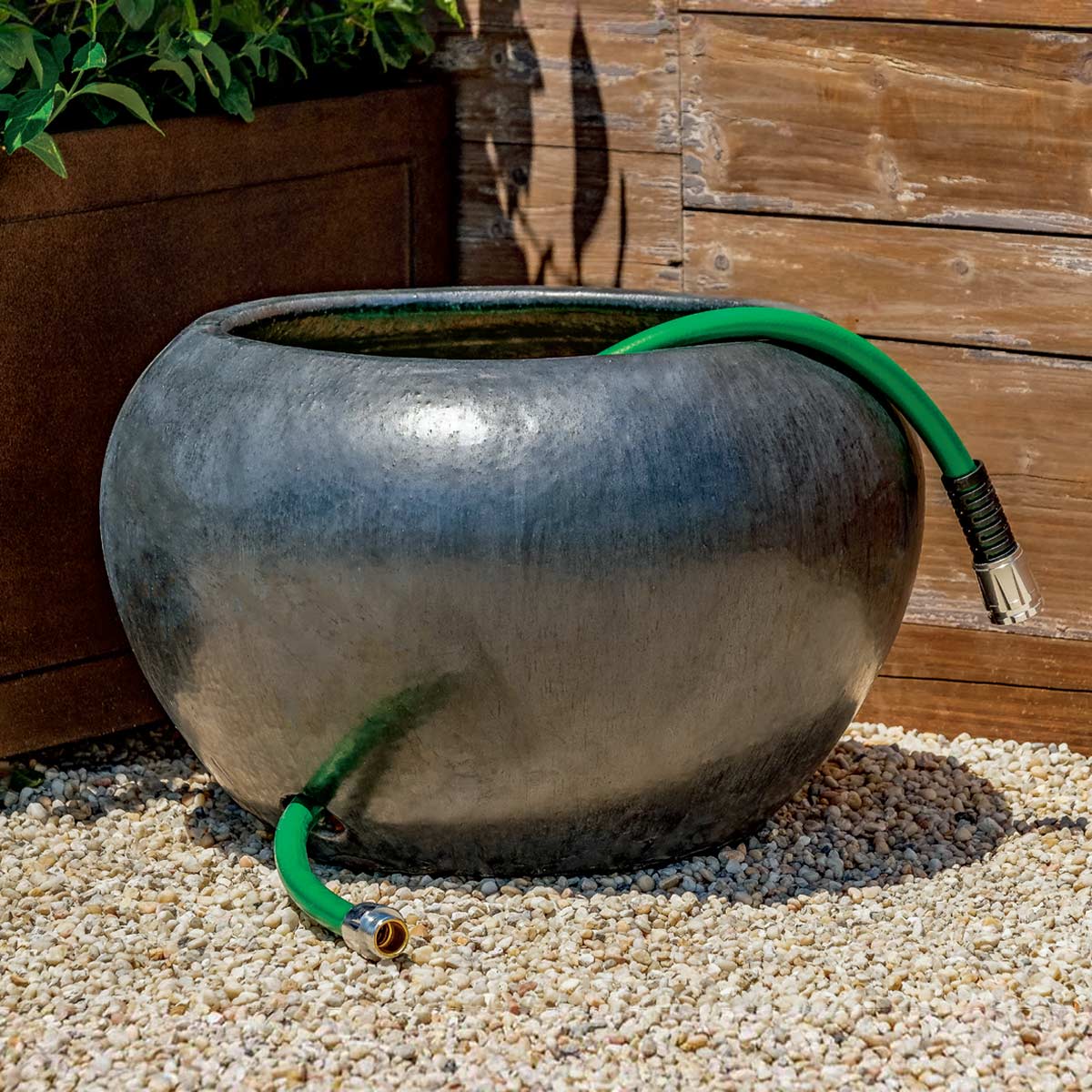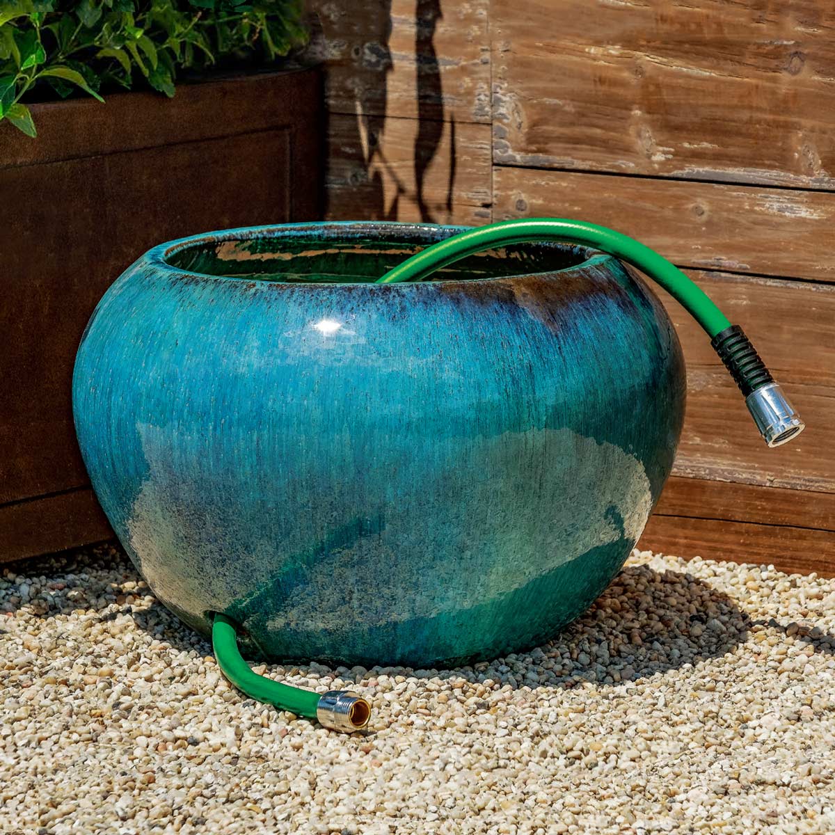 A practical solution for containing messy garden hoses, this Hose Pot is handcrafted from terracotta with three beautiful glaze finish options. Featuring a drainage hole on the base, it accommodates a standard 50′ garden hose (hose not included). Its subtle form blends well with other outdoor garden planter containers.