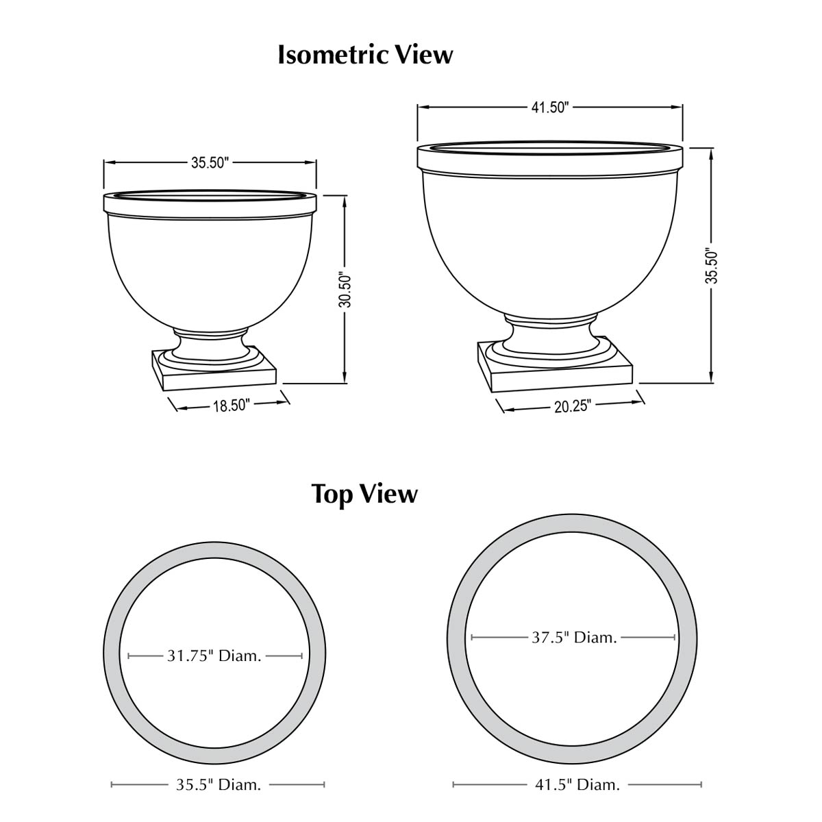| Size | 25″DIA x 21.25″H | 166 lbs 35.5″DIA x 30.5″H | 528 lbs 41.5″DIA x 35.5″H | 706 lbs |