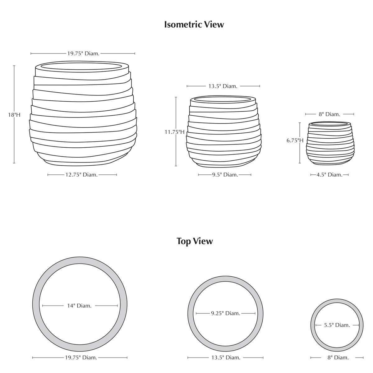 | Size | Set of 3 19.75″DIA x 18″H | 55 lbs 13.5″DIA x 11.75″H | 21 lbs 8"DIA x 6.75"H | 6 lbs |