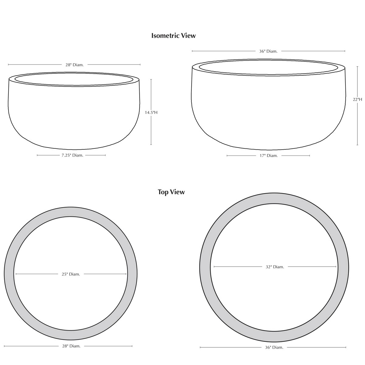 | Size | 28"DIA x 14.5"H | 203 lbs 36"DIA x 22"H | 506 lbs |