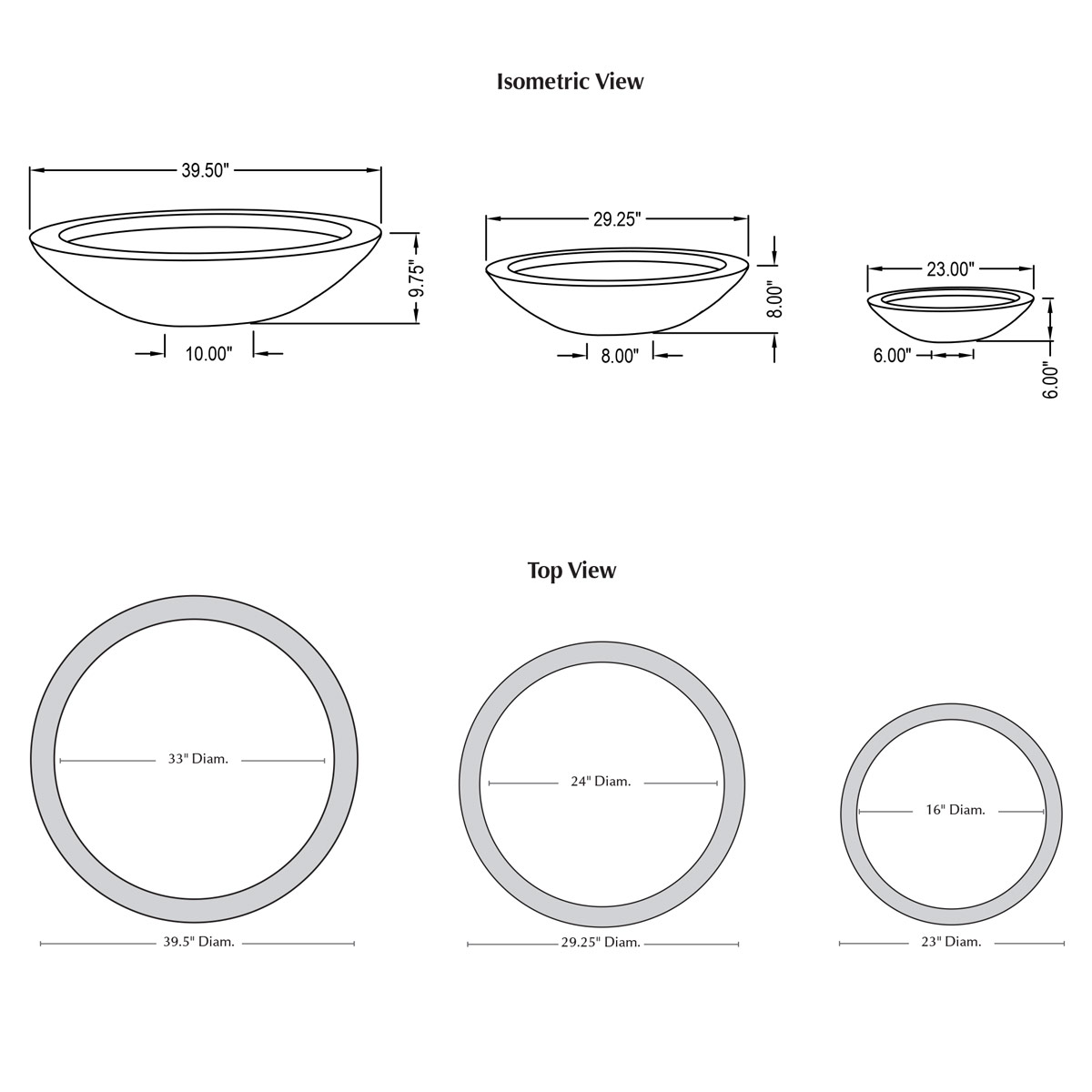 | Size | 39.5"DIA x 9.75"H | 198 lbs 29.25"DIA x 8"H | 105 lbs 23"DIA x 6"H | 55 lbs |