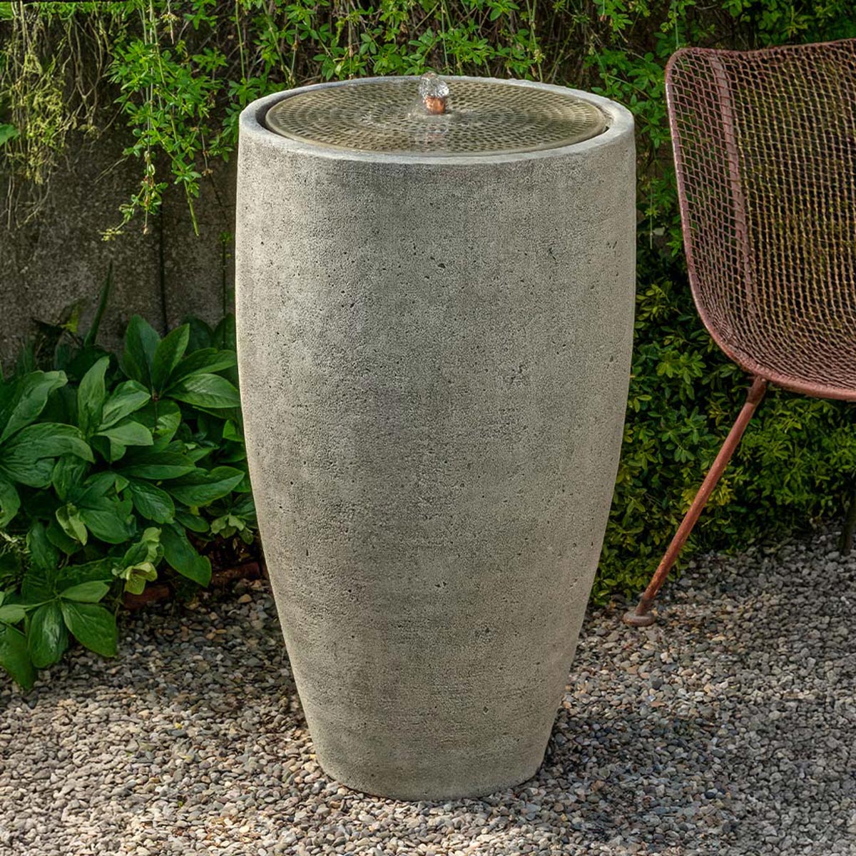 The Manzanita Cosmos Fountain has a central bubbler and a textured water table surface, creating a soothing sound effect. Crafted from cast stone in a variety of finish options, this narrow fountain boasts a minimalist contemporary design. See other options in the Manzanita Series.