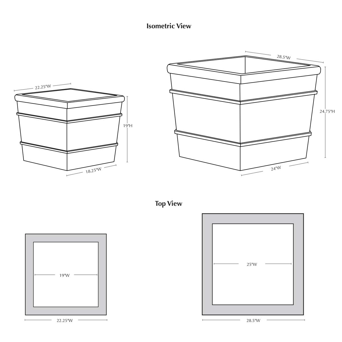 | Size | 22.25″W x 19″H | 18.25"Sq. (base) | 15"-19"Sq. x 17"H (inside) | 188 lbs 28.5″W x 24.75″H | 24"Sq. (base) | 21"-25"Sq. x 23"H (inside) | 345 lbs 36.25″W x 30.75″H | 30.25"W (base) | 810 lbs |