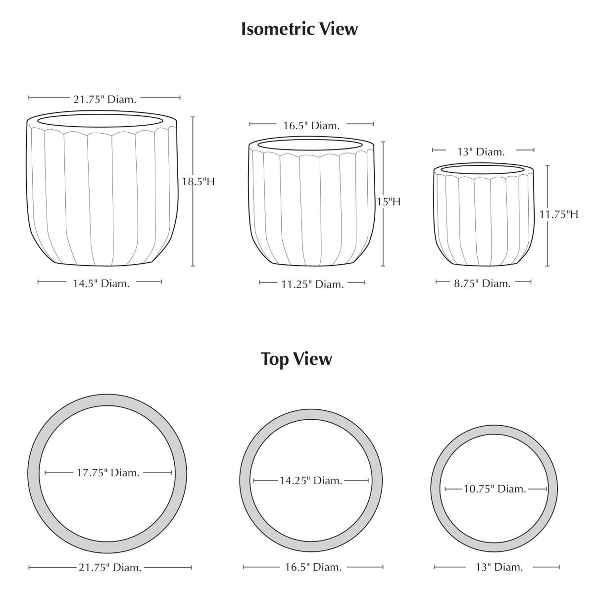 | Size | Set of 3 21.75″DIA x 18.5″H | 88 lbs 16.5″DIA x 15″H | 44 lbs 13″DIA x 11.75″H | 24 lbs |