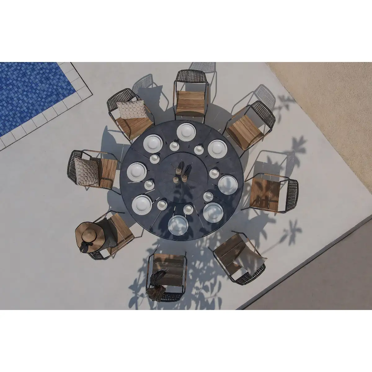 The innovative MEIKA outdoor furniture collection features distinctive style, and is suitable for commercial or residential use. This all-weather 71″ MEIKA Round Dining Table is made of stainless steel in a hairline or powder-coated finish with a high pressure laminate (HPL) top featuring a built-in, 29.5″ rotating “lazy Susan” tray in the center. Seats 6-8.