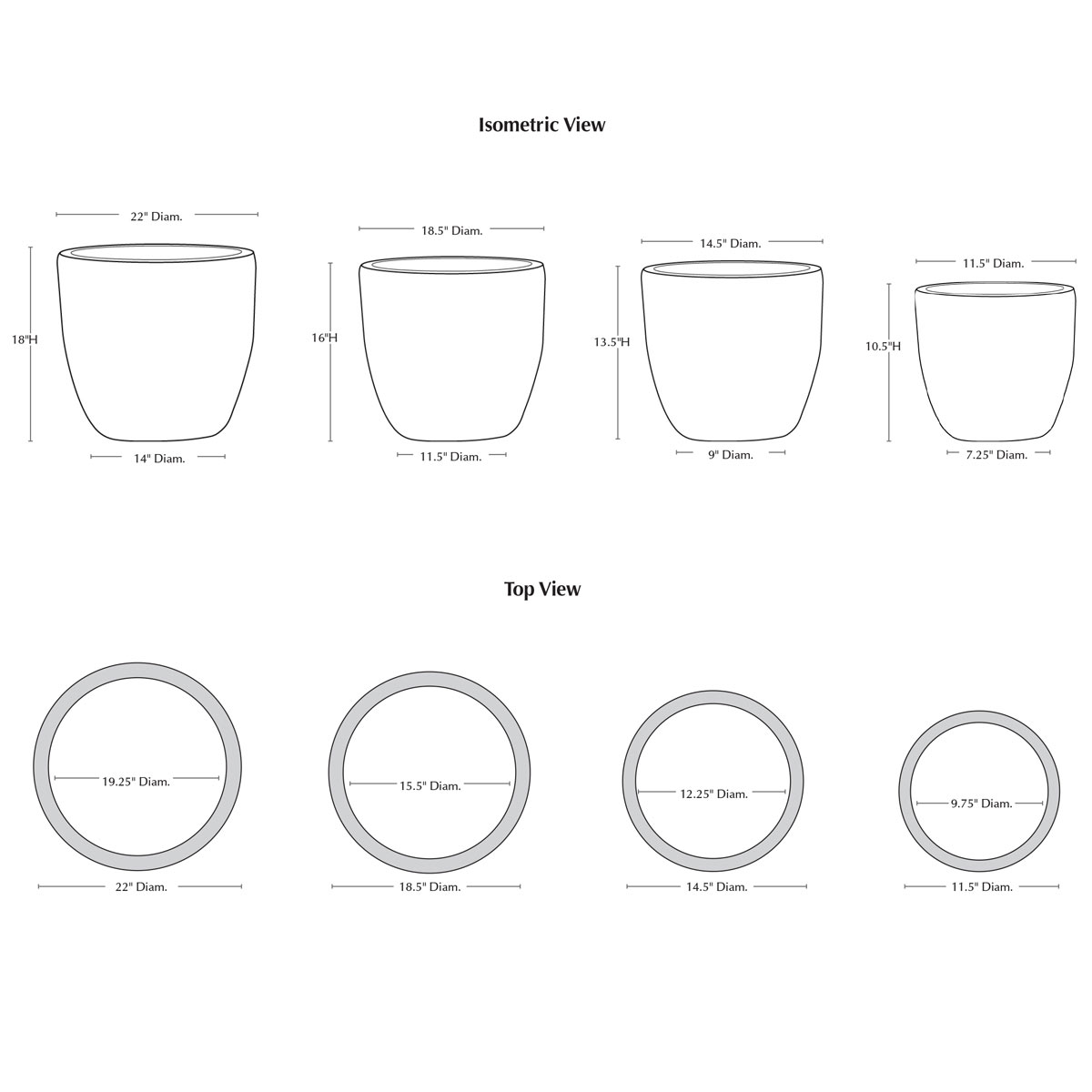 | Size | Set of 4 22"DIA x 18"H | 72 lbs 18.5"DIA x 16"H | 47 lbs 14.5"DIA x 13.5"H | 32 lbs 11.5"DIA x 10.5"H | 15 lbs |
