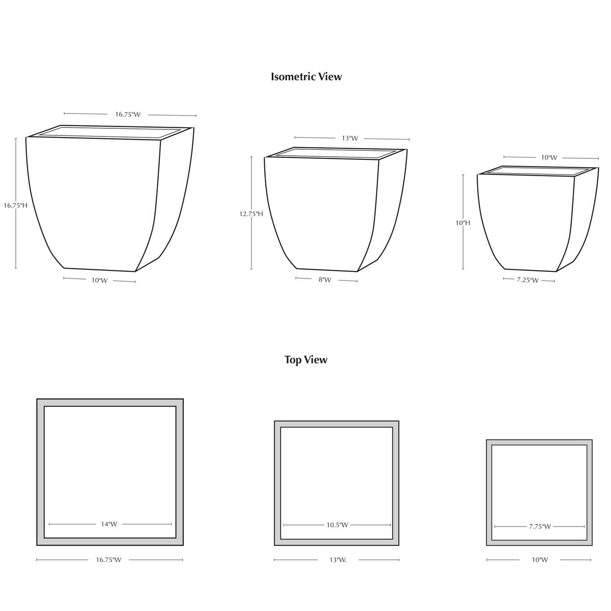 The three-piece Mika Square Planter set has a modern look with tapering sloped edges. Ideal for groupings, fill them with colorful flowers or smaller shrubs. These compact containers are crafted from terracotta and include a drainage hole in the base.