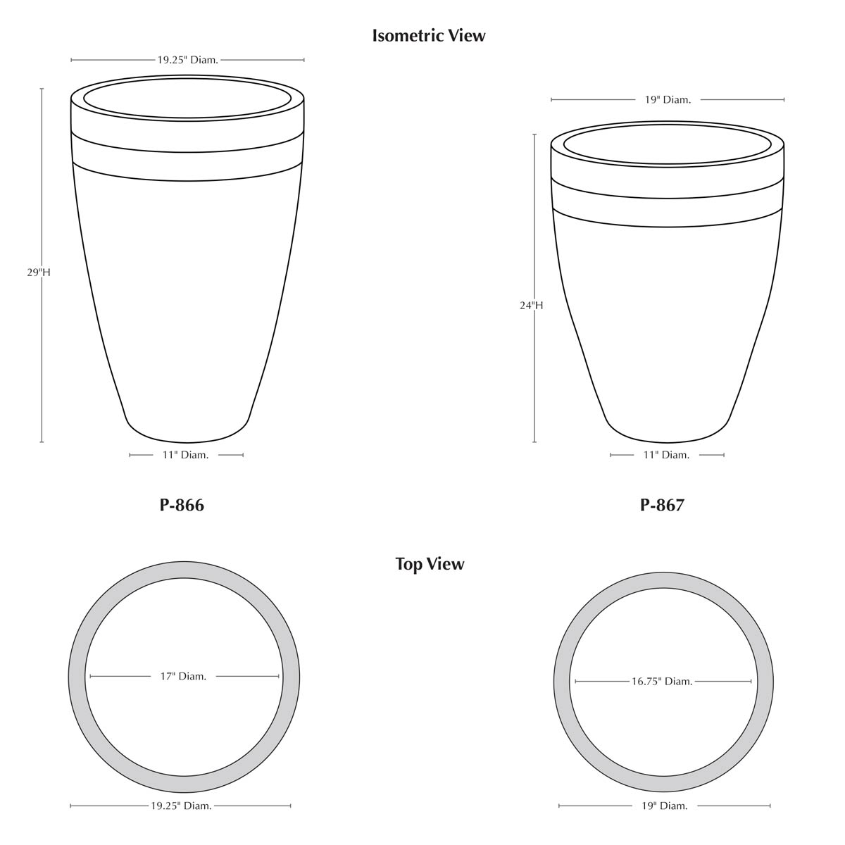 Copper band detailing lends a stylish accent to the Moderne Tapered Planters. Available in two heights, as well as Moderne Urns (with small pedestal base) these compact garden containers are a great option for deeper rooting shrubs and flowers. They are crafted from durable cast stone in a variety of finish options.