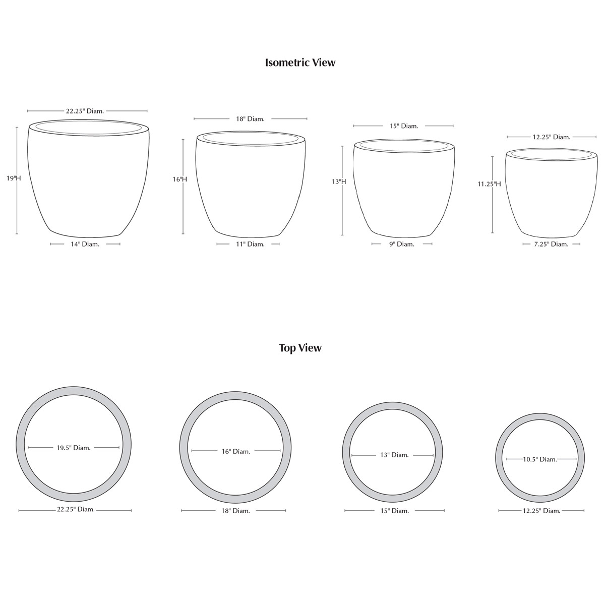 | Size | 22.25"DIA. x 19"H | 65 lbs; 18"DIA. x 16"H | 45 lbs; 15"DIA. x 13"H | 26 lbs; 12.25"DIA. x 11.25"H | 16 lbs. |