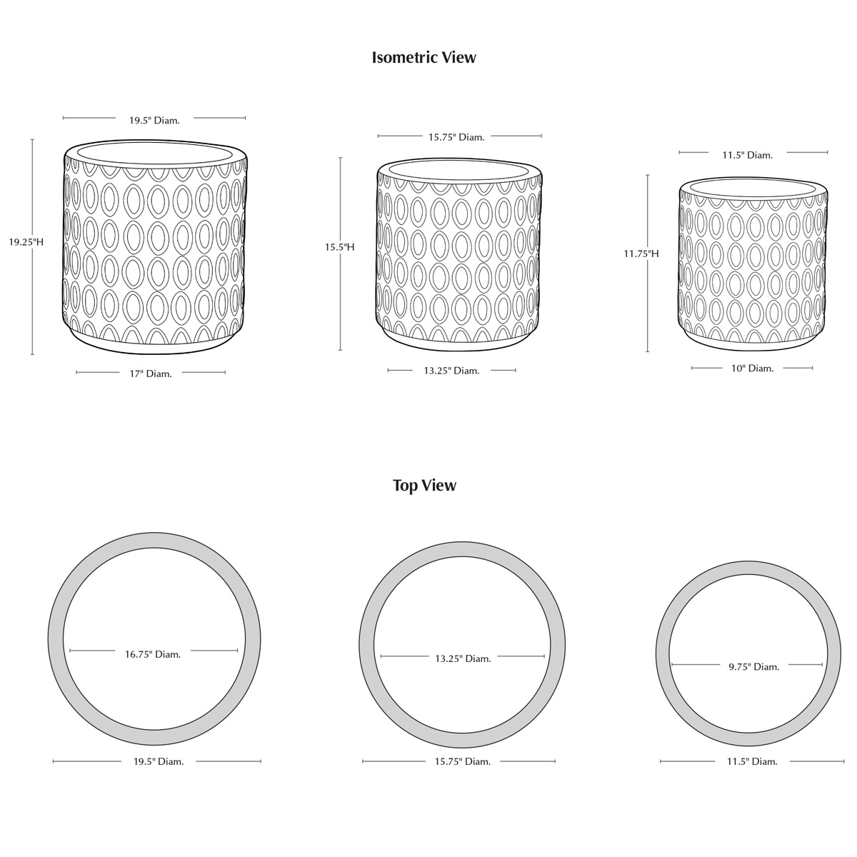 | Size | Set of 3 19.5"DIA x 19.25"H | 78 lbs 15.75"DIA x 15.5"H | 49 lbs 11.5"DIA x 11.75"H | 24 lbs |