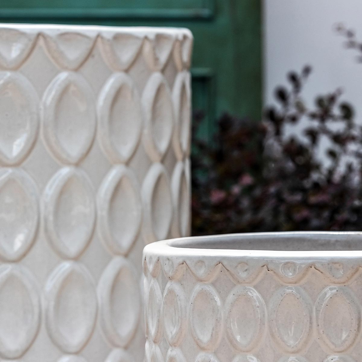 The Oriel Planter set includes three cylindrical planters showcasing a unique raised patterning and traditional glazing. With contemporary shapes of varying heights, they’re ideal for creating cohesive plant groupings. For a lower profile, see the Oriel Low Planter set.