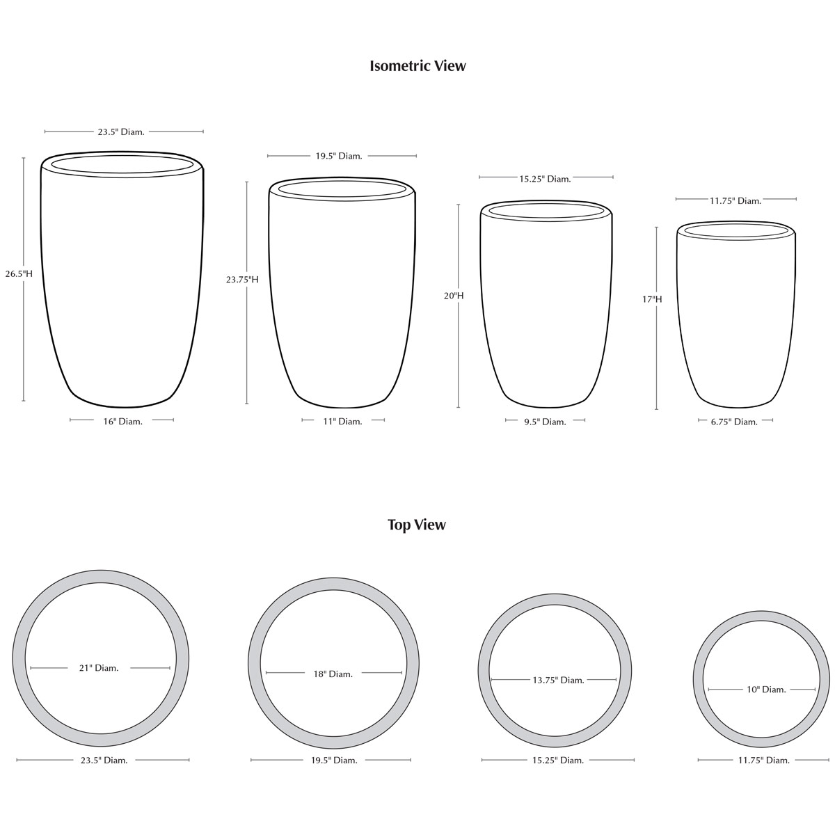 | Size | Set of 4 23.5" DIA x 26.5"H | 95 lbs; 19.5" DIA x 23.75"H | 73 lbs; 15.25" DIA x 20"H | 53 lbs; 11.75" DIA x 17"H | 24 lbs. |