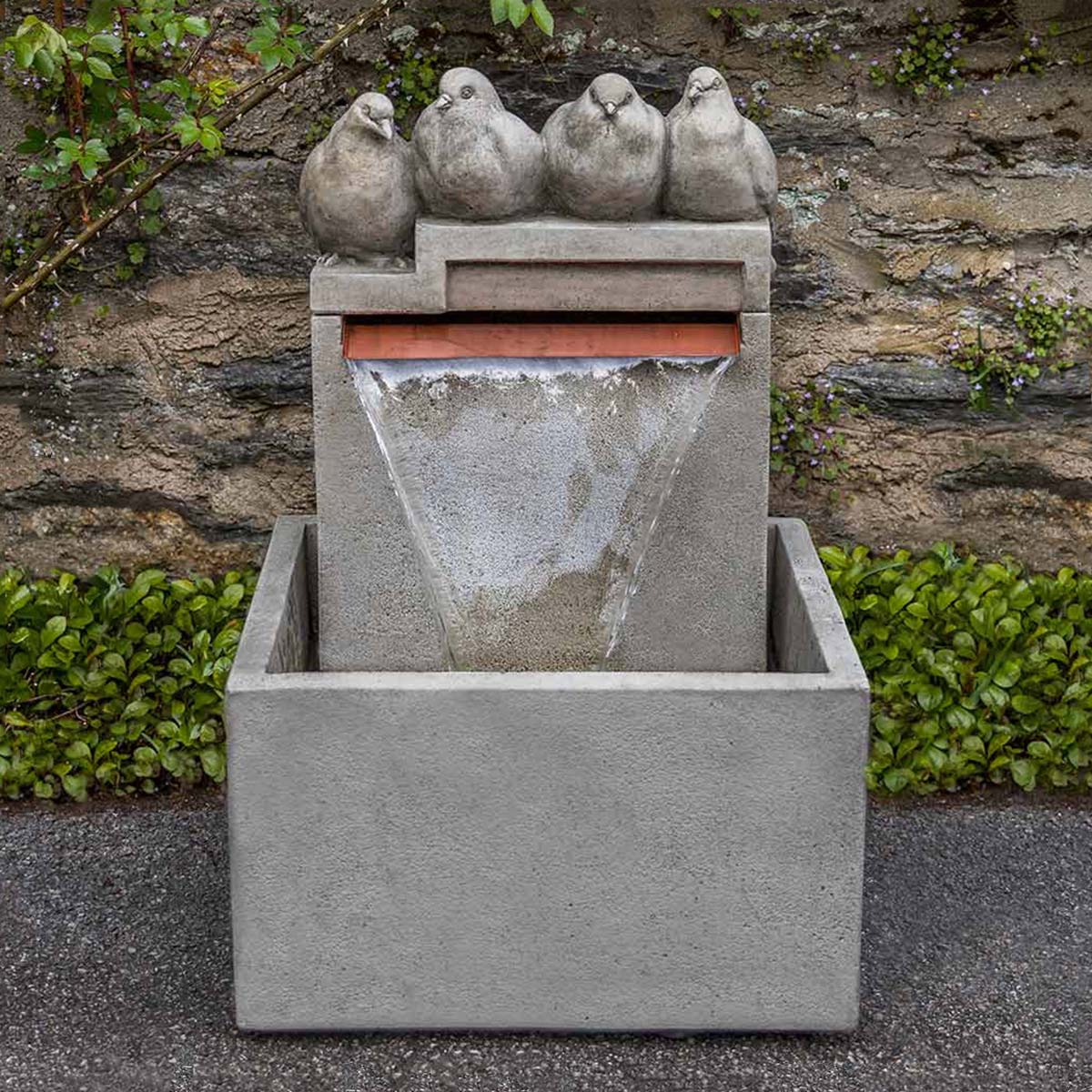 A modern take on a bird bath water feature, our charming Quartet Fountain includes four birds perched atop its compact form. Its sleek design features a waterfall with square trough basin, and is enjoyable to both admire and listen to. Place it in front of a garden wall or among your favorite plants for a contemporary look.