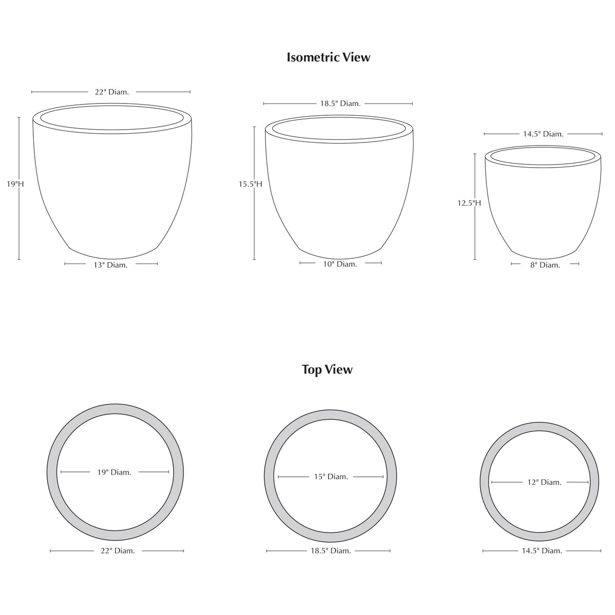 | Size | Set of 3 22"DIA x 19″H | 32 lbs 18.5"DIA x 15.5″H | 21 lbs 14.5"DIA x 12.5"H | 12 lbs |