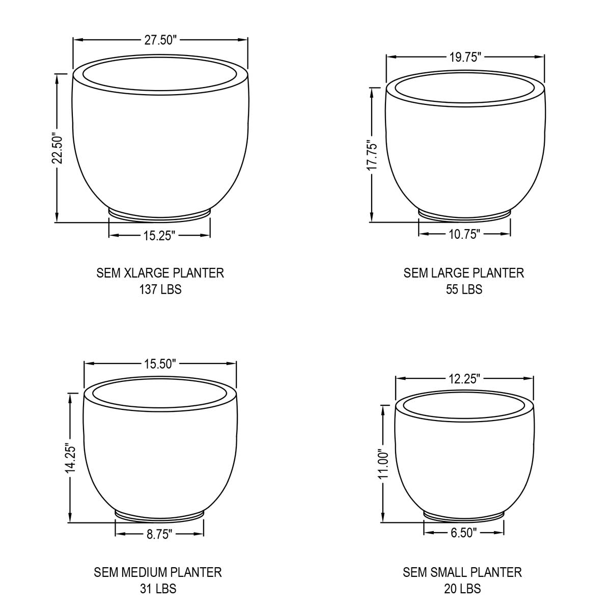 | Size | 12.25"DIA x 11.00"H | 20 lbs 15.50"DIA x 14.25"H | 31 lbs 19.75"DIA x 17.75"H | 55 lbs 27.5"DIA x 22.5"H | 137 lbs |