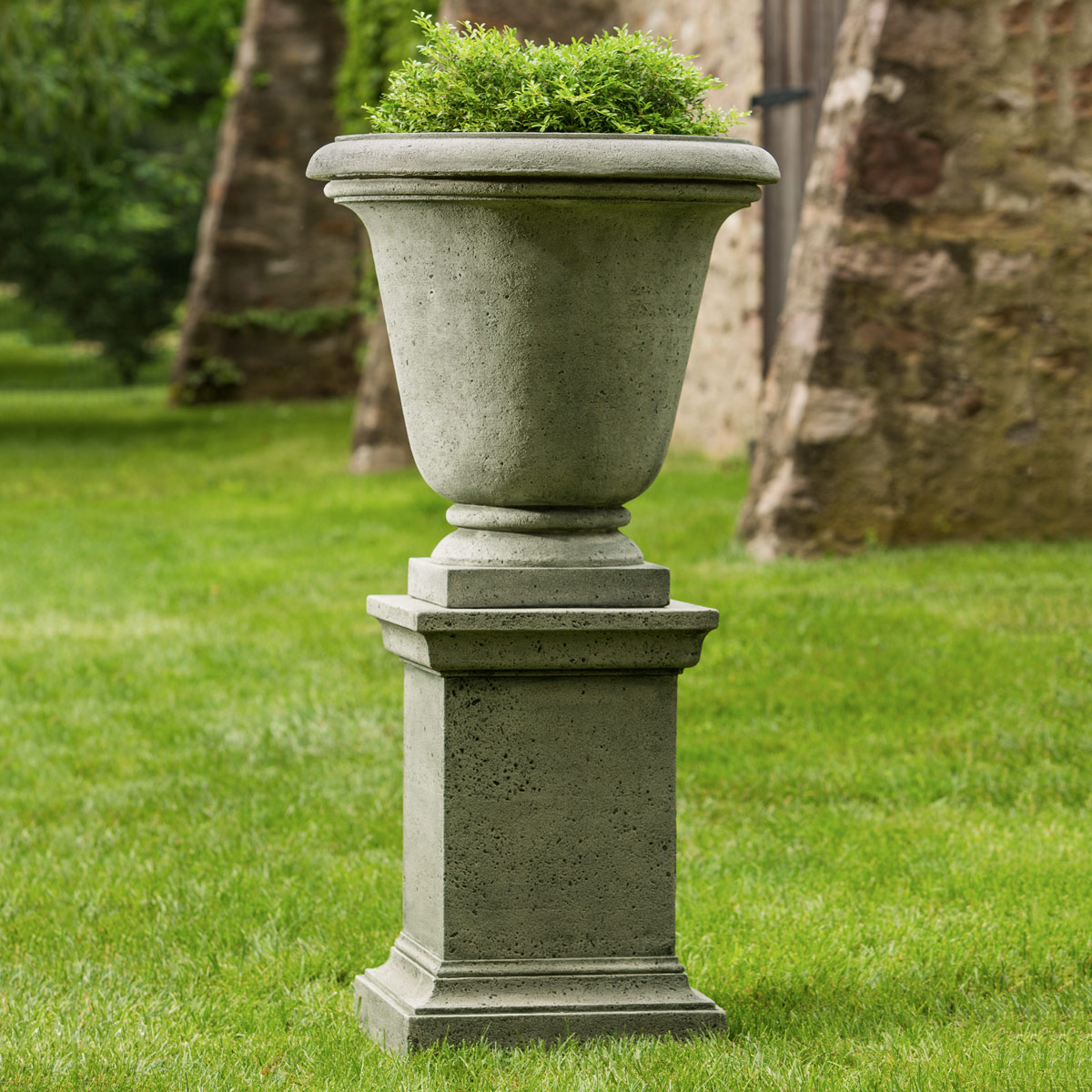 The Textured Hampton Urn has a simple shape with a deep bowl that is suited to taller shrubs. It is crafted from cast stone, in a variety of rustic finish options, to blend with your outdoor decor palette. Raise it on an optional pedestal for dramatic effect.