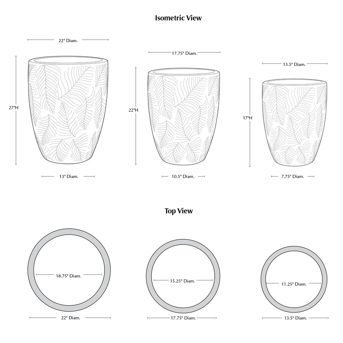 | Size | Set of 3 22"DIA x 27" H | 106 lbs 17.75"DIA x 22" H | 65 lbs 13.5"DIA x 17" H | 35 lbs |