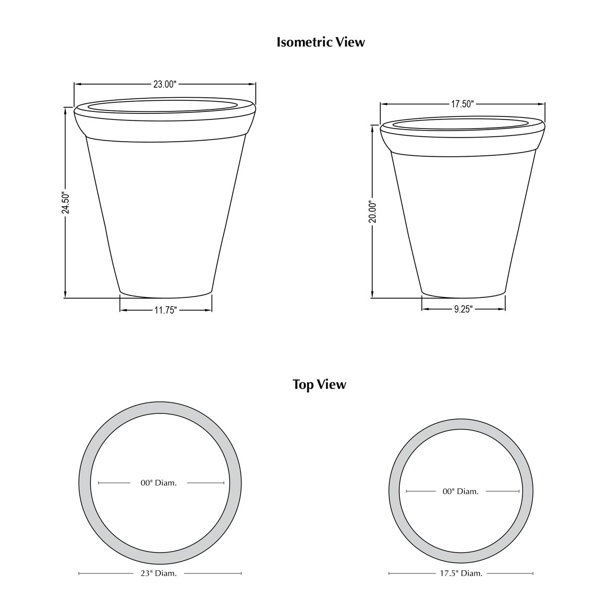 | Size | Set of 2 23″DIA x 24.4″H | 65 lbs 17.5″DIA x 20″H | 43 lbs |
