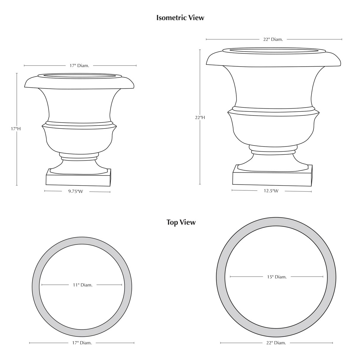 | Size | 17"DIA x 17"H | 9.75"(base) | 77 lbs 22"DIA x 22"H | 12.5"(base) | 165 lbs |