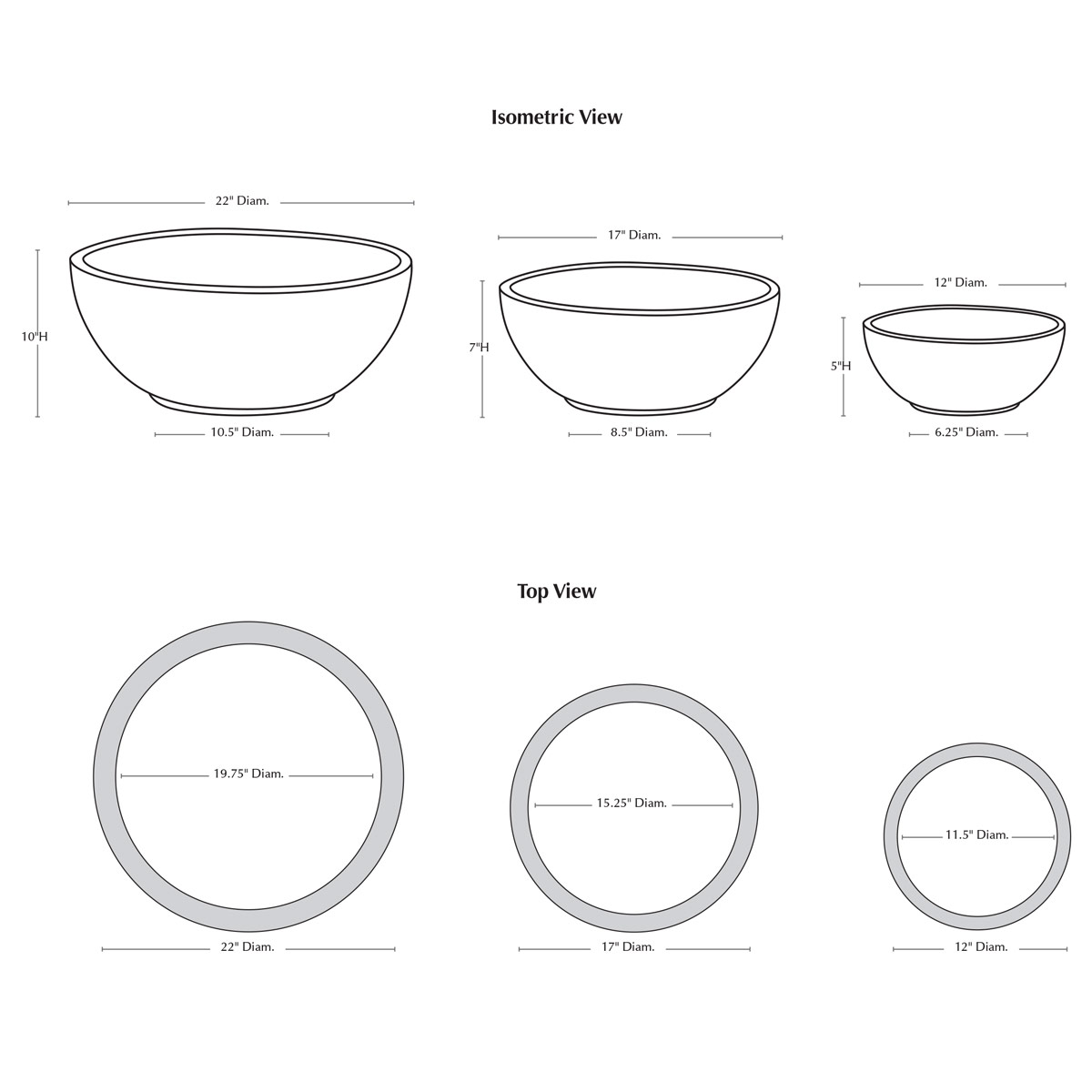 | Size | Set of 3 22"DIA x 10"H | 39 lbs 17"DIA x 7"H | 19 lbs 12"DIA x 5"H | 7 lbs |